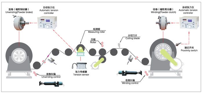 由于磁粉離合器/制動器具有以上特性,現(xiàn)已廣泛就用于造紙、印刷、塑料、橡膠、紡織、印染、電線電纜、冶金以及其他相關卷取加工行業(yè)中收卷和放卷張力的控制。下面是一套較為完整的張力控制系統(tǒng)示意圖。