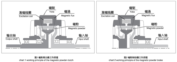 磁粉離合器是由主動轉子(輸入軸)、從動轉子(輸出軸)、含激磁線圈的磁軛組成,三部分相對同心裝配,形成了一個可以相對轉動的整體,在主動轉子和從動轉子之間的環(huán)形空隙(工作腔)內填有高導磁性的合金磁粉。