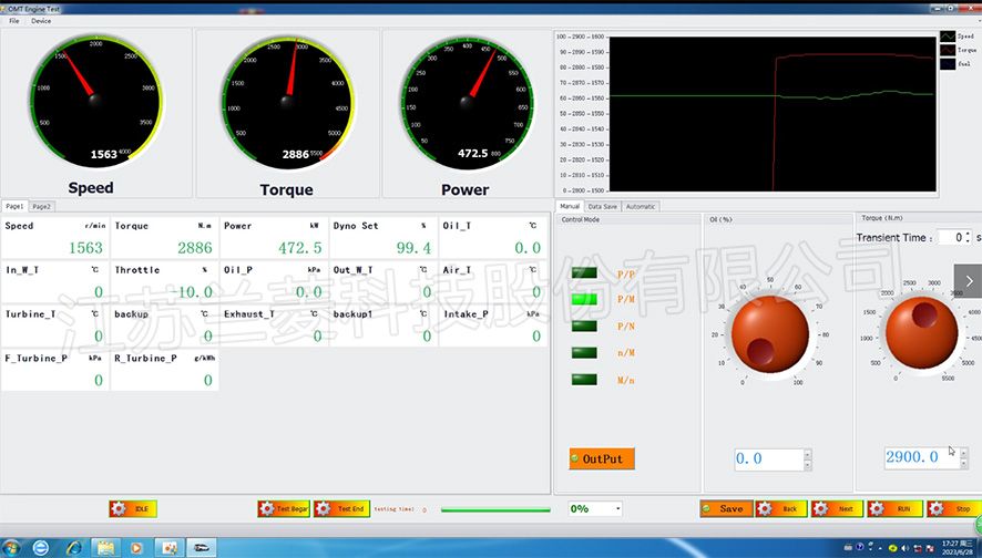 The entire host computer control system takes configuration-specific software as the core, and is equipped with software such as test condition editing, test data processing, and test process control. The data exchange between the upper and lower computers is realized through the field bus, and the entire engine test control process is completed. Data processing and screen display. All measurement parameters can be displayed on the liquid display. Display mode: digital display and curve display. Torque, power and fuel consumption can be automatically corrected by the computer, and the correction formula can be automatically selected according to the model (according to the national standard GB/T18297-2001), or it can be calculated by the operator.