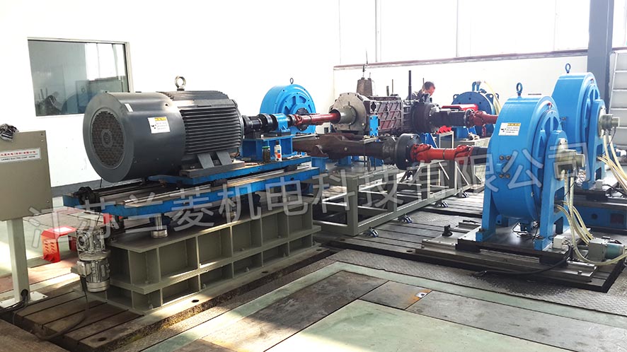 110Kw 4-level frequency conversion motor + ZJ-1000A torque speed sensor + transition seat + universal joint is connected with the front axle spline. The motor is installed on the linear guide rail, and it can be moved forward and backward through the hand crank of the lead screw. The center height of the motor platform can be adjusted manually up and down, four linear bearings and guide columns keep the motor shaft parallel, and the two lifting reducers save the balance at both ends. When the front axle is tested separately, the installation method of the front axle is opposite to that when the four-wheel drive is tested together, and the input shaft is installed in reverse. The input power part is connected to the front axle through a lifting mechanism to lower the center height of the input shaft.